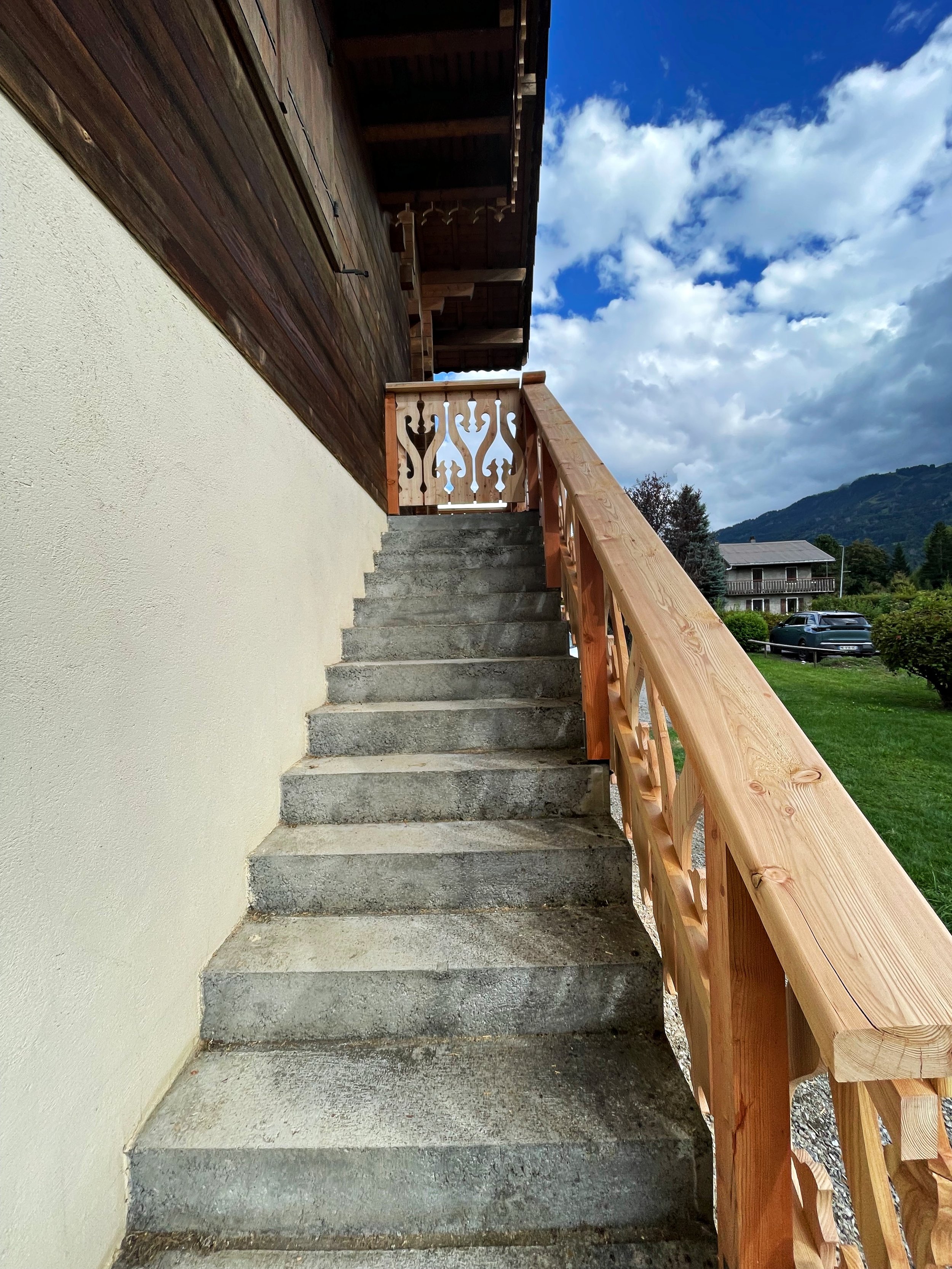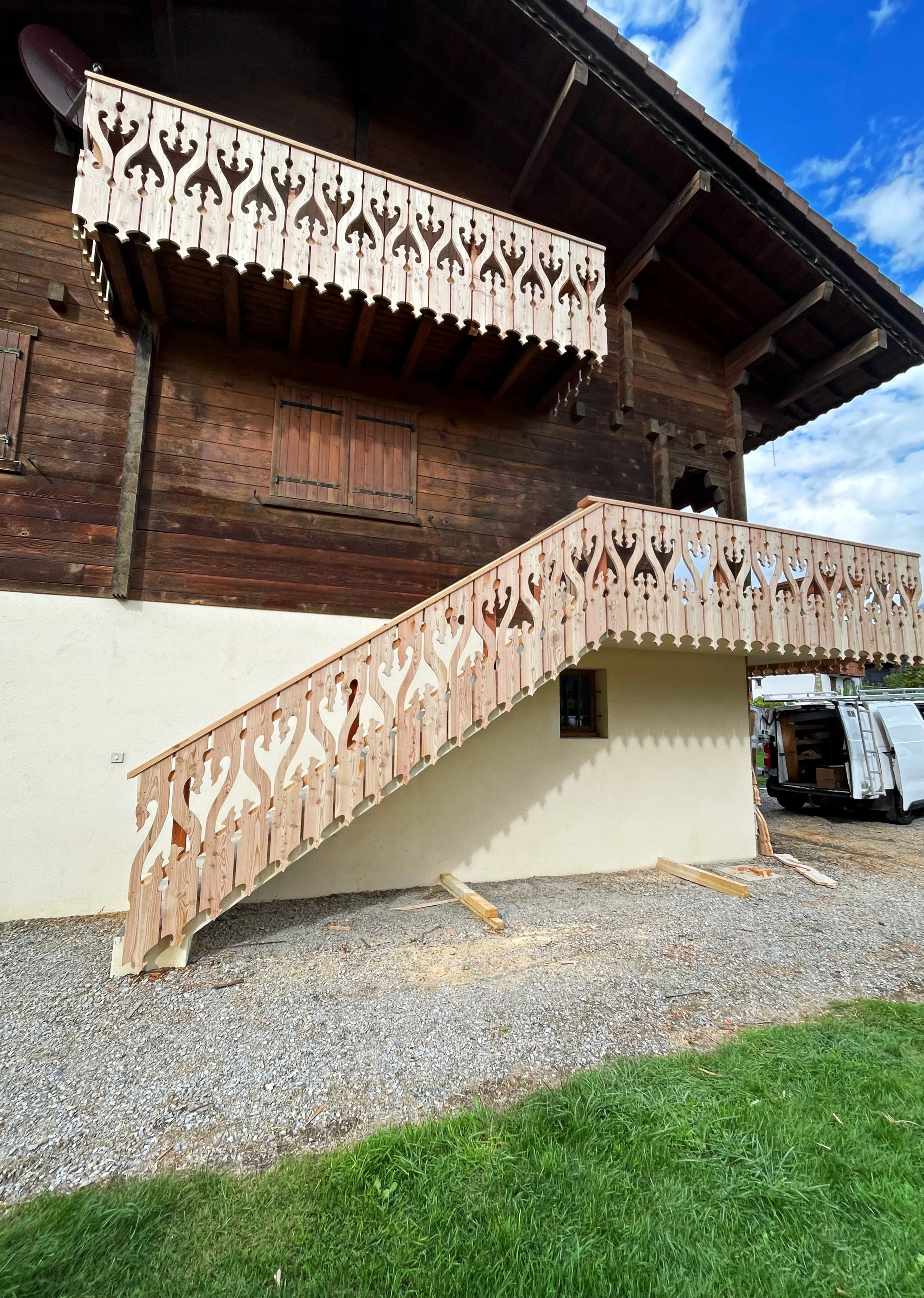 Reproduction à l’identique pour conserver le charme d’origine, avec un travail de découpe et d’assemblage soigné sur mesure. Une rénovation fidèle au style traditionnel savoyard.